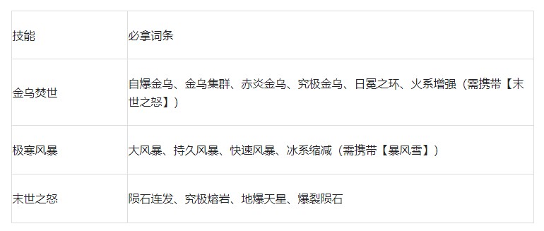 搭配说明:【金乌焚世】首充即可获得,技能使用时覆盖范围可观,搭配【金乌集群】增加金乌数量后,几乎能覆盖近半屏,再结合【极寒风暴】的冰冻效果,能显著提高推关效率。【末世之怒】、【暴风雪】除了能为玩家补足伤害外,也是激活【火系增强】和【冰系缩减】的必要挂件。