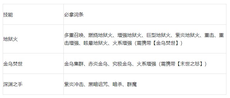 搭配说明:【地狱火】在发动时能召唤地狱火与玩家协同攻击,且地狱火的持续时长远久于技能的冷却时间,所以可一直在场上输出,再加上还有【金乌焚世】、【末世之怒】这两个火系技能的配合,可将敌人卷入火焰海洋令它们焚灭。【深渊之手】作用是禁锢敌人,完成控场。