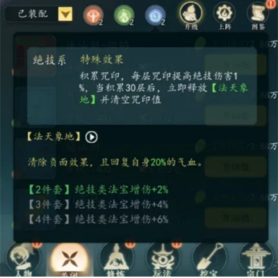 当释放绝技系法宝技能时,可产生被动咒印值,每层咒印值能够提高绝技系法宝的伤害1%,最高累积达到30层将会立即释放神通技【法天象地】,并清空咒印值,法天象地可使人物清除所有身上的负面效果,并回复自身20%的气血量。