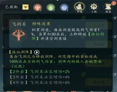 当释放飞剑系法宝技能时,可产生被动剑意值,每层剑意值能够提高飞剑系法宝的伤害1%,最高累积达到30层将会立即释放神通技【诛仙剑阵】,并清空剑意值,造成一定伤害的同时剑阵内的敌人将会受到禁法(沉默效果)。
