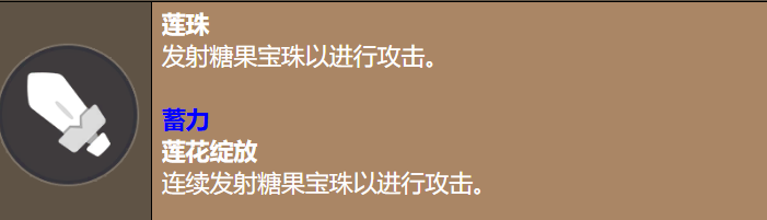 普通攻击叫「莲珠」,就是发射糖果宝珠攻击敌人。这个攻击的主要作用不是造成多高的伤害,而是稳定地给敌人叠「烦恼」状态。蓄力版本叫「莲花绽放」,会连续发射多颗宝珠,覆盖范围更广,适合面对多个敌人的时候用。在实际战斗里,普攻的频率要保持住,不然「烦恼」状态没叠上去,后面的技能伤害就会少一截。