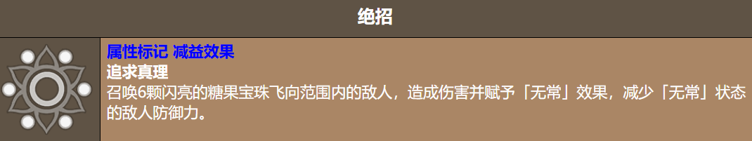 绝招「追求真理」是她最强的输出技能。释放之后会召唤6颗糖果宝珠飞向范围内的敌人,造成伤害的同时还会附上「无常」状态,降低敌人的防御力。这个减防效果对后续的输出帮助很大,不管是自己继续打还是队友跟进,都能吃到这个减防的好处。而且绝招本身也有属性标记,对弱点敌人的伤害加成会叠加上去,爆发力相当强。