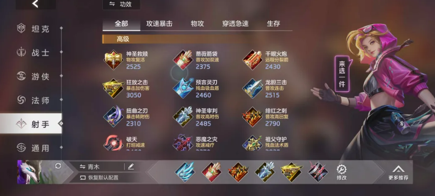 出装方面,刀锋之翼前期提供攻速和普攻伤害,对线更稳;蔷薇箭袋双速加成,基本上必出;神圣审判给普攻附带额外伤害,攻速也有加成;狂放之力比较关键,但不要和扭曲之刃同时出,两件一起效果会打折。最后一件可以根据情况选平衡支配者或者破天,如果需要保命可以考虑换绯红之刺。
