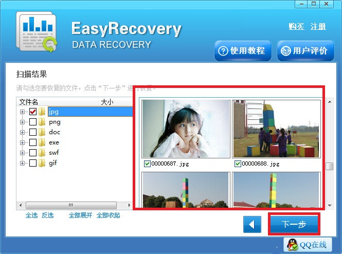 第三步:扫描结束之后,在界面左侧找到误删文件对应的格式点击,右侧就显示有具体的文件信息,找到并确定是为需要的文件之后勾选上,之后点击右下角的“下一步”按钮。