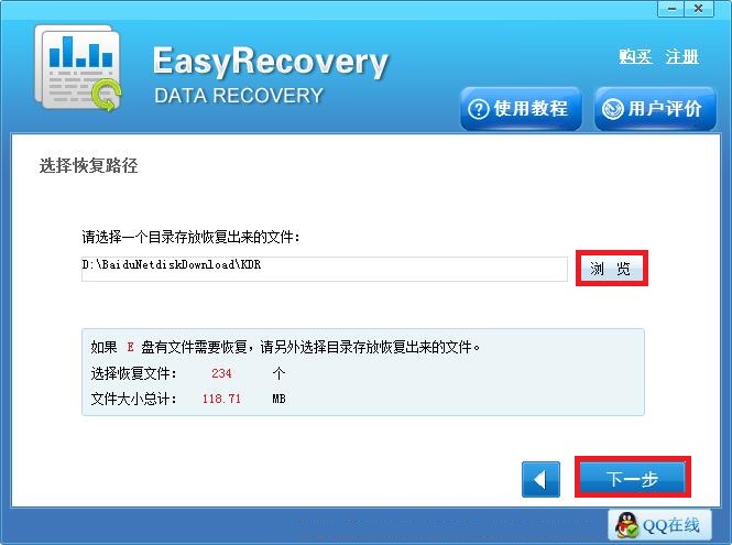 第四步:通过点击“浏览”按钮自定义选择好恢复后文件所需的存储位置之后,点击右下角的“下一步”按钮,软件就开始恢复选中的文件了,待恢复完成之后可前往查看结果。