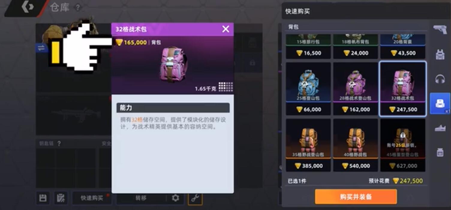 玩家在跑刀之前还需要在装备跟战备方面做好充分的准备。通常玩家来到困难工厂的时候,需要有20万的战备值。另外大家需要注意的就是一定要选择合适的背包可能有些背包看上去标价是25万32格,但实际在使用的时候,玩家发现此时此刻根本就进不去,所以说最稳妥的方法就是直接上35格的金质背包。背包容量比较大,能够装很多的物资。另外,大家如果想要兼顾效率跟隐蔽,就直接选择32格的背包,这个主打的就是看玩家自身的情况。