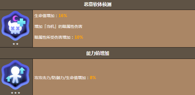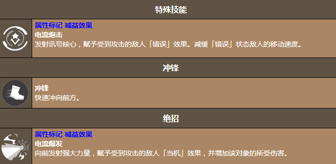 从二星到五星,每一次的升级都会让这位特工的实力可以更上一层楼。二星解锁恶意软体侦测,生命数值提升的同时,可以强化带来的暗属性伤害。让暗属性输出会更有震慑力,三星全属性小幅度提升之后,攻防血的均衡增长,让它在战场上会拥有更好的续航能力。四星解锁版本更新之后,防御力还会大幅度的提升电流爆发,还有电流炮击的伤害就可以直接增加25%技能的威慑力是很不错的。看似很完美的他也有一些小软肋,这位时刻保持挺拔站姿的特工,一旦遇到计划外的突发情况,就会像突发故障的机器人一样,直接愣住。