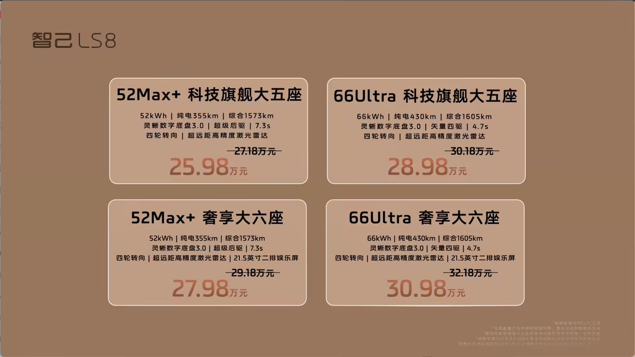 智己汽车旗下全新中大型增程 SUV—— 智己 LS8 已开启预售,新车共推出 4 款车型,预售权益价为 25.98-30.98 万元。