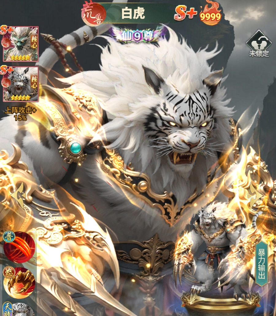 此外,白虎在高星时还具备着能为自己施加增益的能力,只要它的星级到达了九星,便可在战斗中进一步激发自己的作战潜能,为自己添加随机层数的嗜血效果,上限为三十层,每一层嗜血都能提高白虎的攻击和吸血倍率,且嗜血效果会一直持续到战斗结束,中途不会掉层。星级到达10星后,白虎每次都能为自己添加至少三层的嗜血效果,令它能更快地将嗜血层数叠高至上限。同时,在达到真仙2重后,每层嗜血还会为白虎提供人形敌人伤害加2%的特性,该效果很容易就能让白虎在PVP玩法里打出较高的伤害,也使得白虎在竞技模式中有着极高的登场率。
