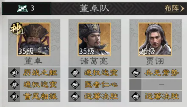 诸葛亮追击技建议更换为“运筹决胜”,其机制为每次承伤提升4%伤害,叠满10层后总增益达40%,显著放大中后期输出压力。配合贾诩“纵傀”的混乱连锁与董卓“独断专权”的群体压制,整套阵容在前3回合即可建立绝对控制优势,战斗节奏完全由我方主导,敌方关键技能几乎无法顺利释放。