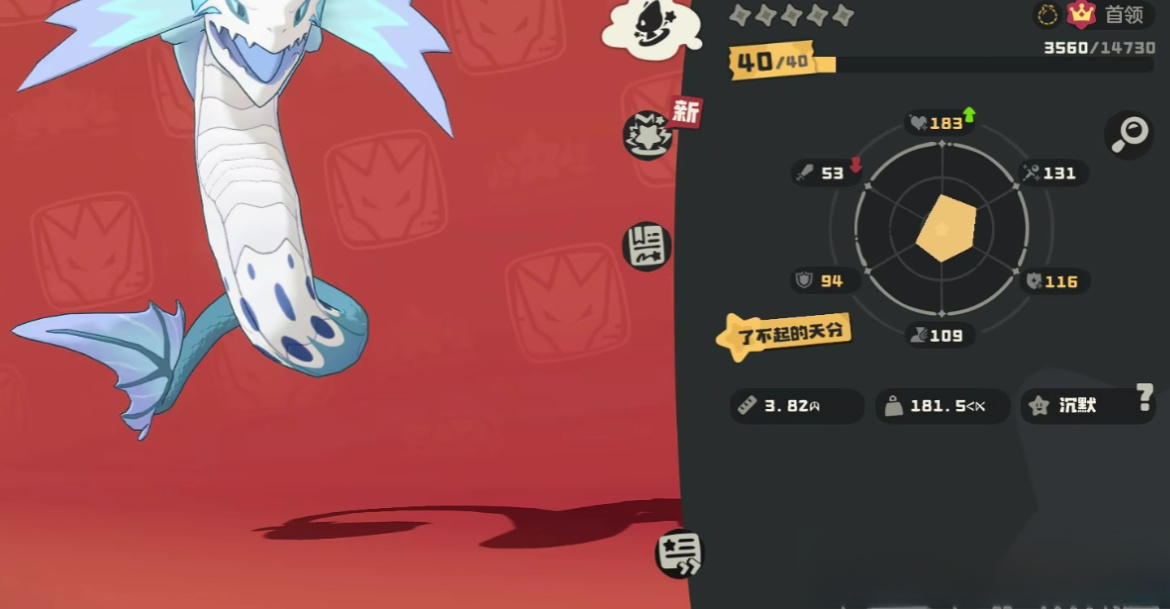 暗影冰龙王种族值总和达到800点,目前版本属于顶尖水平。具体来看,精力144点、攻击135点、防御125点、魔攻118点、魔抗138点、速度140点。这样分布使速度、精力成为它的最大特点,攻击力也较强。尽管双抗没有特别夸张,但是都保持在120以上,整体属性非常均衡,没有明显的短板。