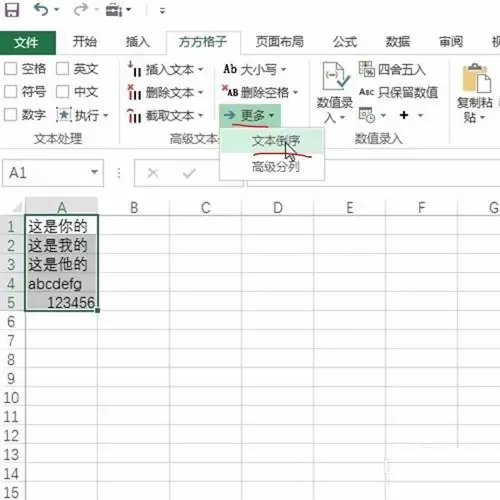 4、点击“方方格子”插件,在其功能菜单中,找到“更多”选项。在下拉列表里,你会看到一个叫“文本倒序”的功能,就是它了。选择它,如下图所示: