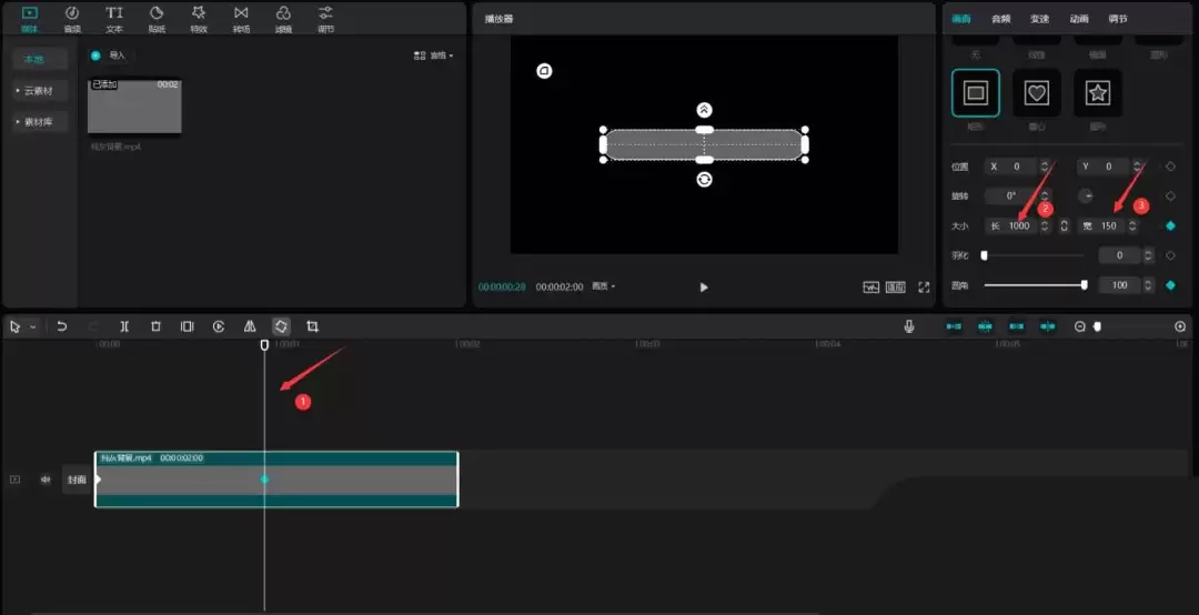 接下来,让这个圆形“展开”成搜索框。将时间轴指针拖动到0.9秒的位置,这时蒙版参数面板会显示可编辑状态。我们将“长”改为1000,“宽”改为150。因为之前有关键帧,剪映会自动在此处生成第二个关键帧,从而形成从圆到长条的变形动画,参数修改见下图。