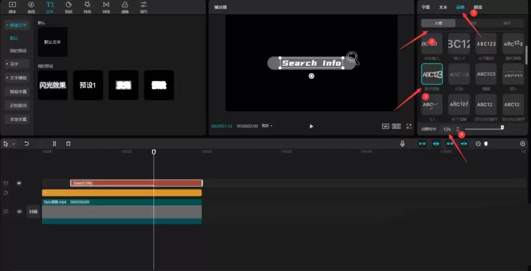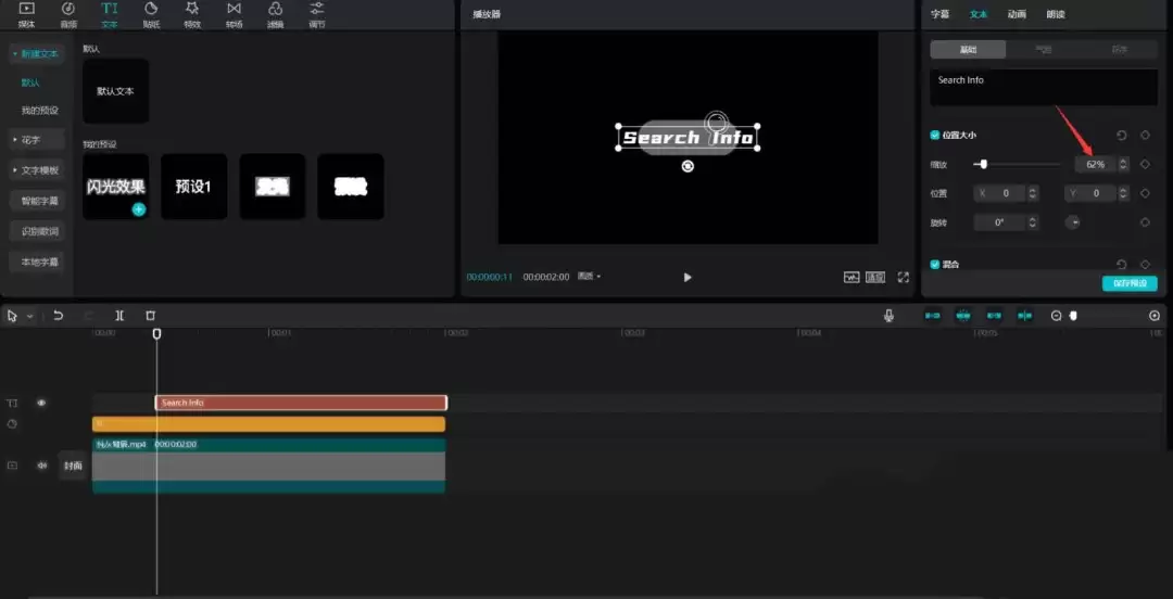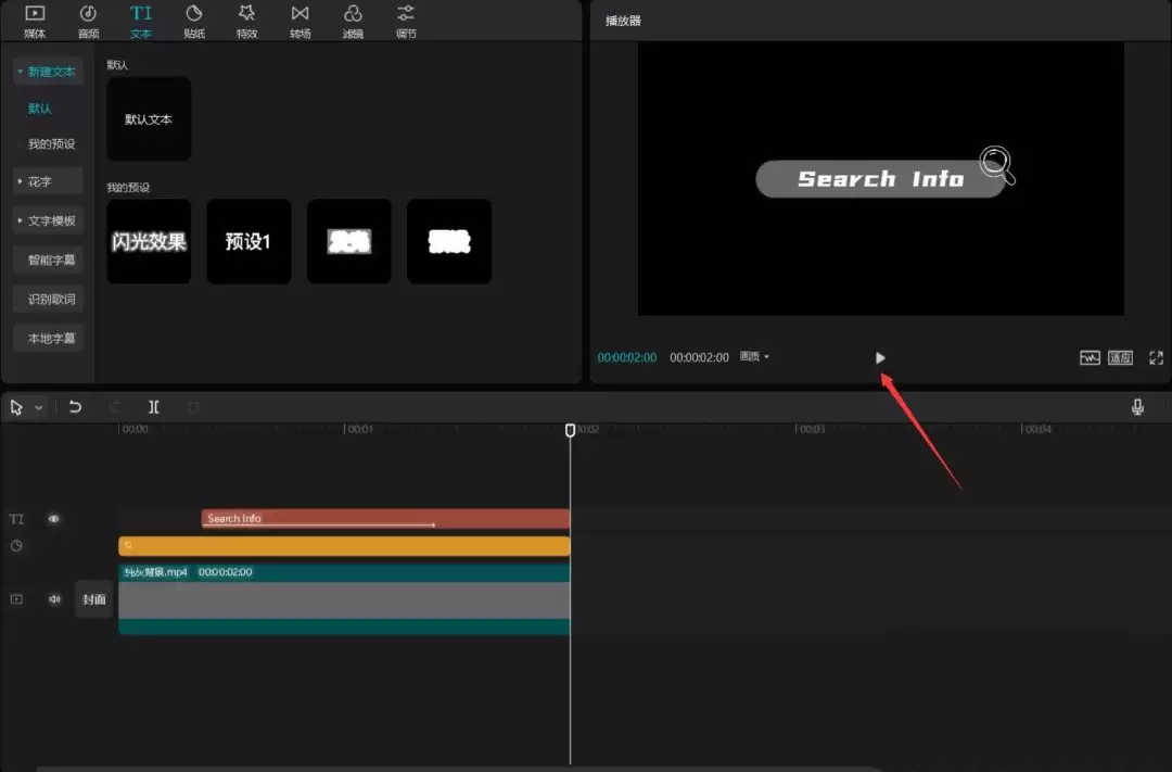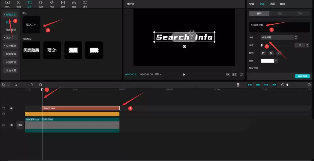 最后,来点提示文字。将时间轴移动到0.4秒左右,点击新建文本,添加一个默认文本。把文本轨道的结尾,与其他素材的结尾对齐。在文本框里输入“Search Info”,字体可以选择“优设标题”这类比较现代的无衬线字体,具体操作如下图所示。