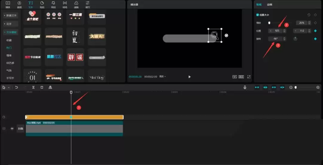 我们要让放大镜随着搜索框的展开一起移动到框内。把时间轴移到0.9秒处(也就是搜索框完全展开的那一帧),更改贴纸的X轴位置为925,并将旋转设置为-90度。这样,放大镜会一边平移一边旋转,自然地“躺”进搜索框里,效果设置参考下图。