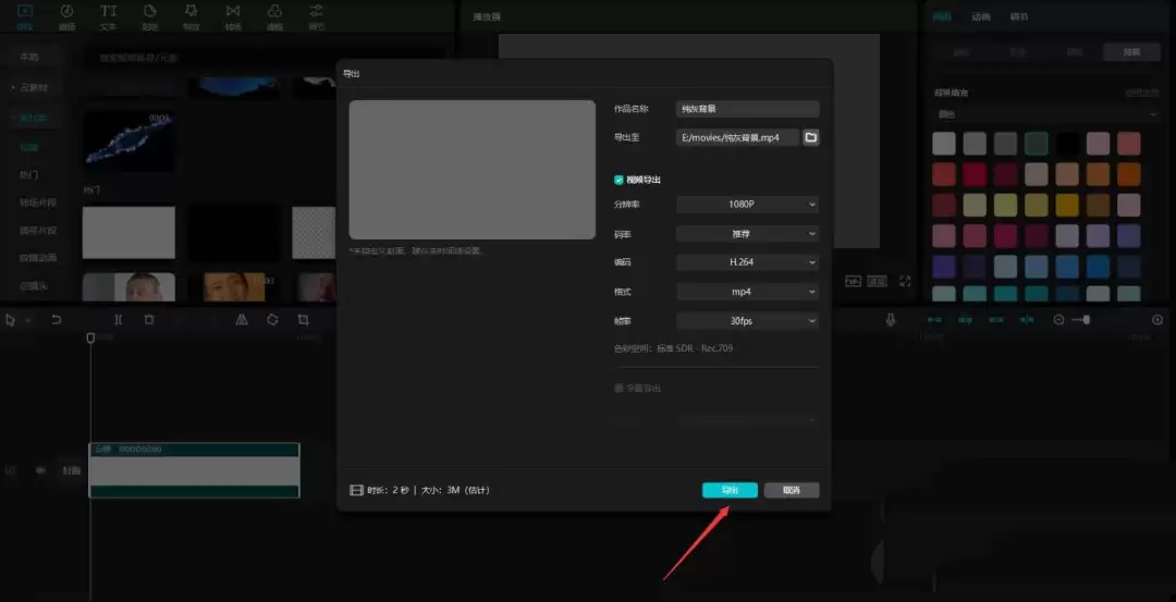 背景设置好后,同时按下键盘上的Ctrl和E键,调出导出面板。直接点击导出按钮,把这段2秒的灰色背景视频保存到本地。这一步很关键,是为后续制作蒙版动画做准备,操作位置见下图。