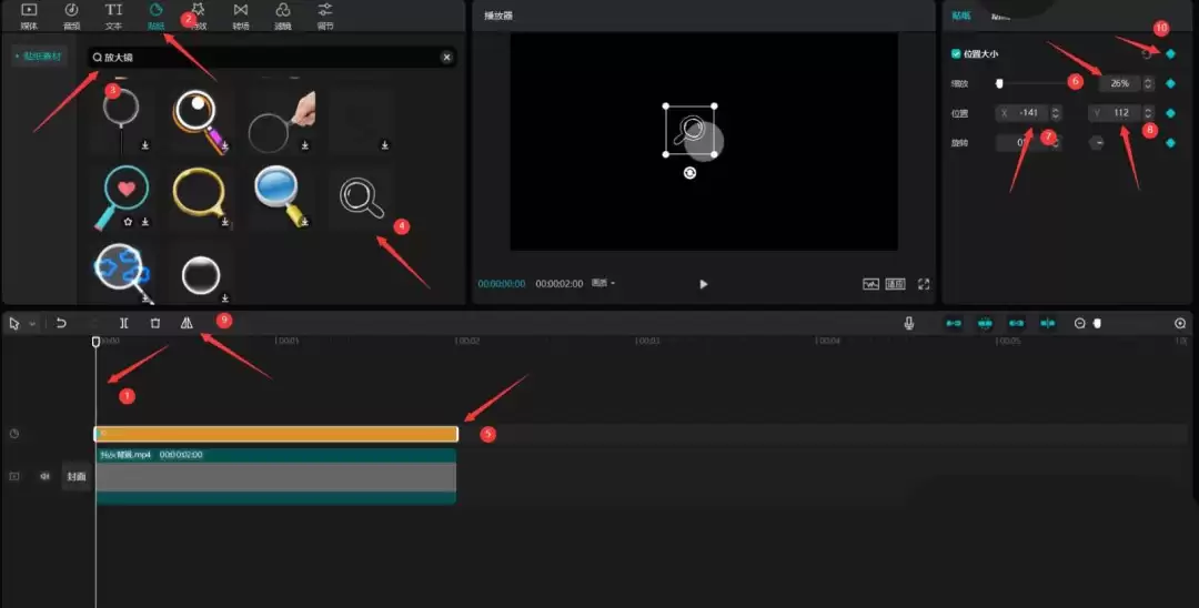 形状动画有了,还得给它配个“放大镜”图标。将时间轴移回0秒处,点击贴纸按钮,在搜索框里输入“放大镜”,挑一个简洁的款式,添加到贴纸轨道上。把贴纸时长也拉满到2秒,缩放调整为26%,位置坐标设为X: -141, Y: 112。然后,点击一下镜像按钮让它朝左,并点击添加关键帧按钮,锁定它的初始状态,详细操作见下图。