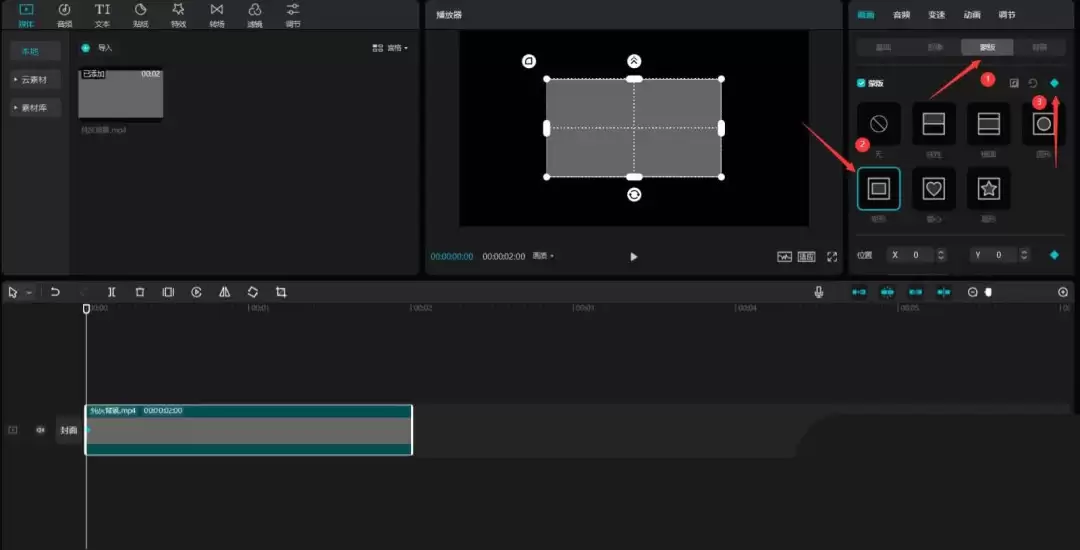 重头戏来了:制作搜索框的形状动画。选中轨道上的视频,点击蒙版按钮,选择“矩形蒙版”。这时,画面上会出现一个矩形框,并且在时间轴起始位置,系统会自动为我们打上一个关键帧,记住这个操作,见下图。