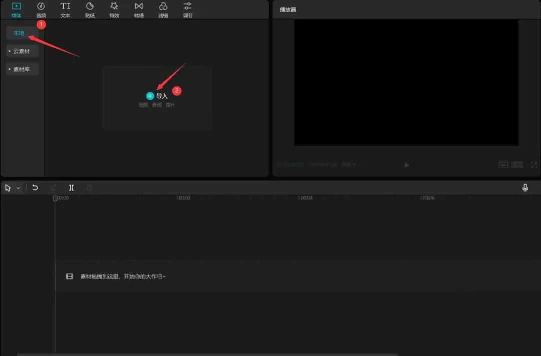 现在,把我们刚做好的“素材”请回来。点击本地按钮,选择导入,找到并导入刚才导出的那段灰色背景视频,操作见下图。