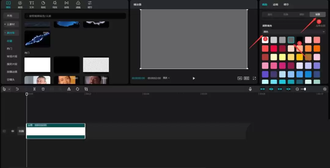第一步,我们先来准备背景。点击媒体按钮,进入素材库,选择白场素材,把它拖到视频轨道上。接着,把这段素材的时长调整为2秒,并将不透明度降到0%。这样我们就得到了一个透明的底,具体操作可以参考下图。