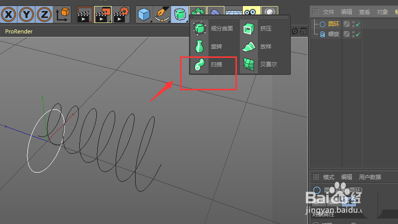 两个基础形状都齐了,好戏正式开场。现在,请在界面上找到“扫描”工具。它的图标长什么样?就在生成器工具组里,仔细找找就能发现。