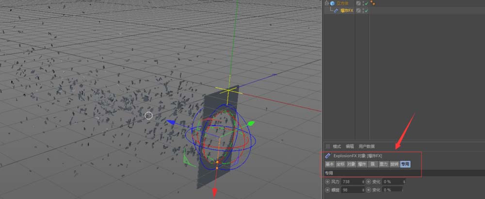 接下来就是实现破碎的核心步骤。在运动图形菜单下,找到并添加“爆炸”效果器。这里有个重要操作:在对象管理器中,直接将这个爆炸FX拖动到立方体对象的下面,使其成为立方体的子级。这样,效果器才能正确作用于这个立方体。