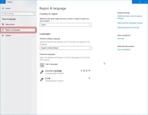 进入后,在左侧菜单中选择【区域和语言】,右侧面板就会显示当前系统使用的语言和相关的输入法设置。
