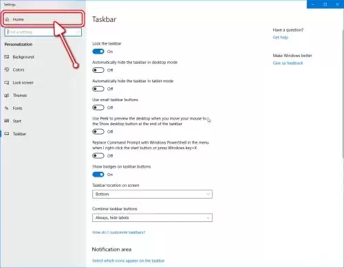 进入任务栏设置界面后,别被侧边栏迷惑,直接点击左上角的【主页】按钮,回到Windows设置的“总控中心”。