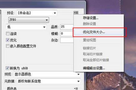 然后我们点击预设旁边的小箭头,在弹出的菜单中选择【优化文件大小】。