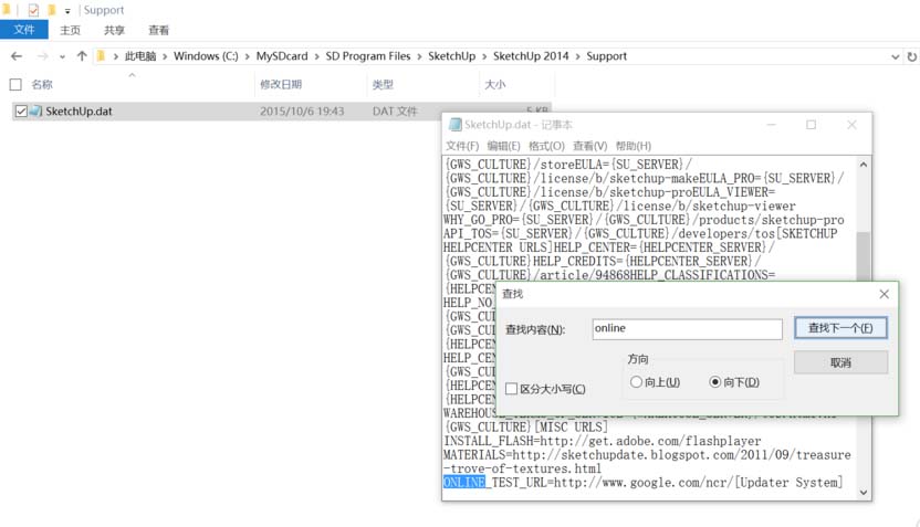 最便捷的方法是:直接在这个“SketchUp.dat”文件上右键,选择“编辑”。这样系统会默认用记事本打开它。文件打开后,按下键盘上的 Ctrl+F 键,调出查找框,输入关键词“online”进行搜索。