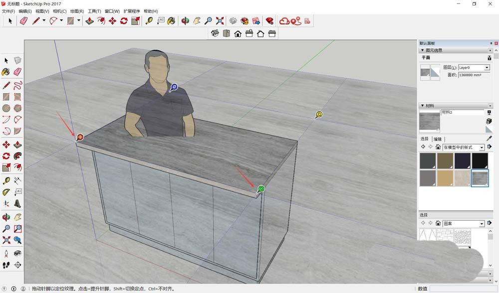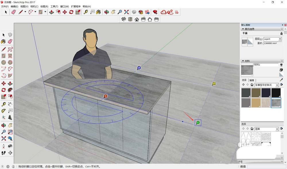 调整到理想状态后,记得重新定义起铺点:把红轴移动到台面的某个端点,然后拖动绿轴让材质刚好铺满红绿轴之间的区域。这个操作能确保材质图案从特定位置开始铺设,保持整体一致性。完成后在空白处点击,退出调整模式。