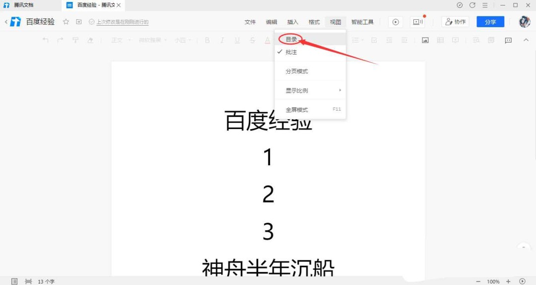 3、点击“视图”之后,会展开一个下拉菜单选项。这里面就藏着咱们需要的功能——直接选择“目录”。