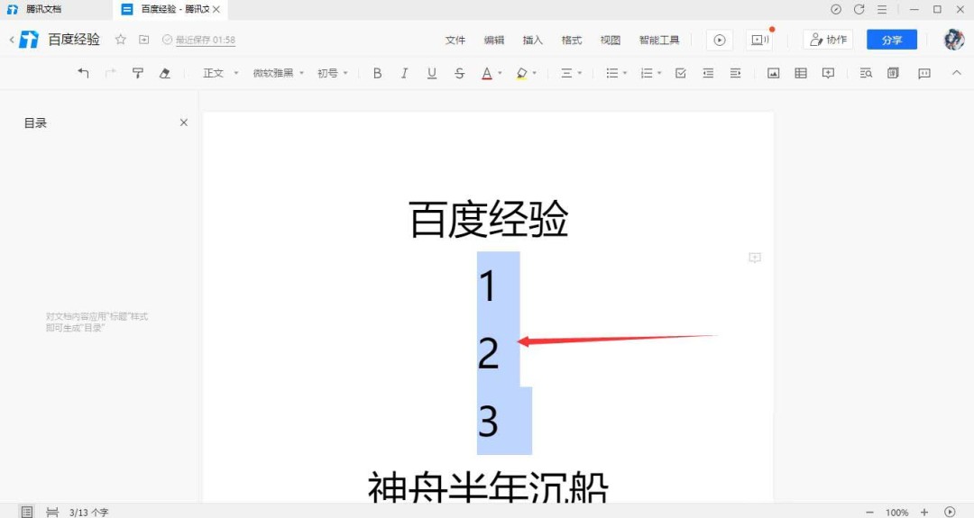 4、操作完上一步,页面会跳转回文档编辑区。接下来要做的,就是用鼠标拖动,选中你计划设置为目录标题的那段文字区域。
