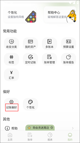 在个人中心页面,找到“记账偏好”这个选项,它通常位于设置相关的区域。