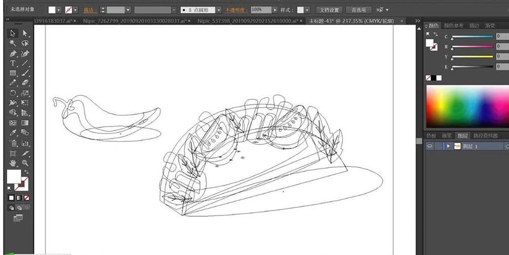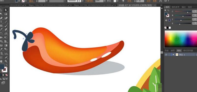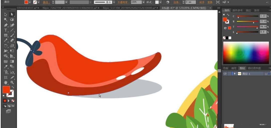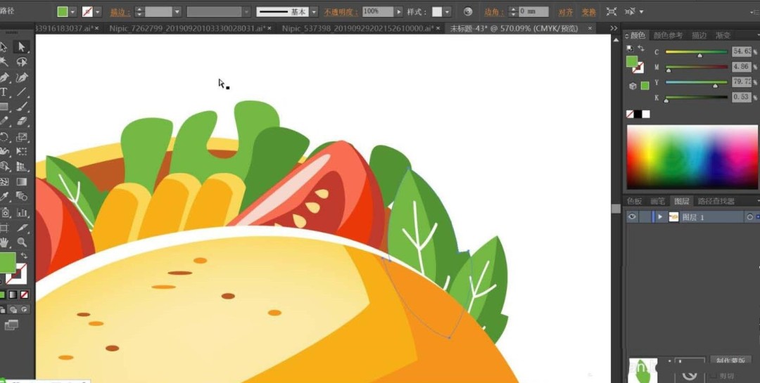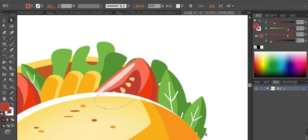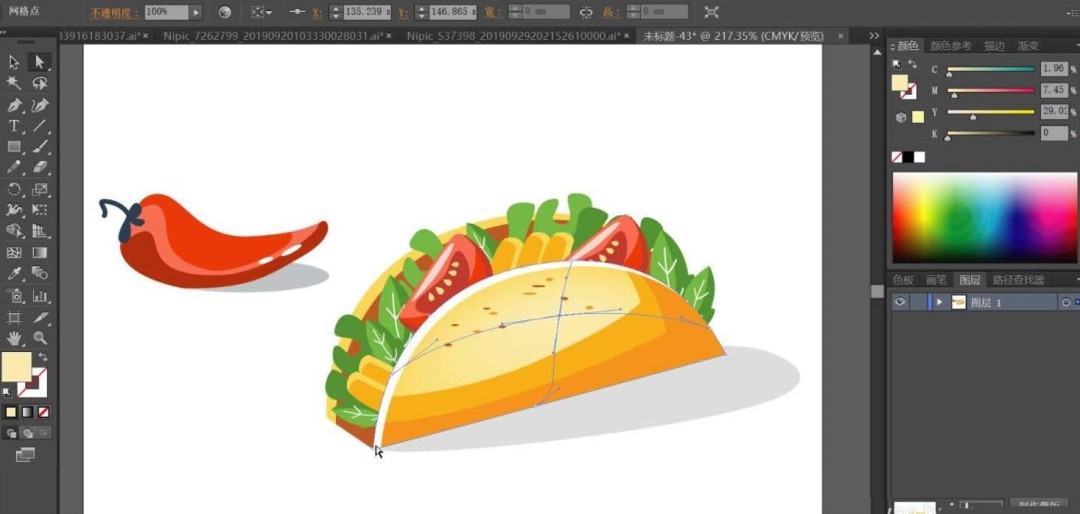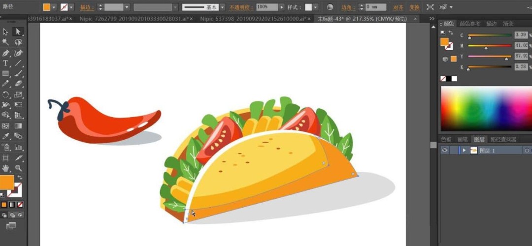 第一步,用钢笔工具勾勒出鸡肉卷的整体轮廓。这一步需要特别注意层次感的呈现:外层的面饼、内层的蔬菜叶、肉块和番茄片都要分别绘制路径。最后别忘了左侧那个点睛之笔——大辣椒的细节路径。