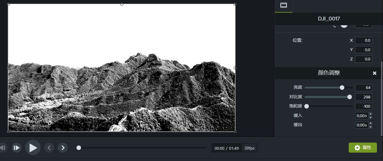 对于“颜色调整“这个没有什么深入可讲的,这个功能就是把片子的基调改为黑白,再通过操作面板上面的”亮度“,”对比度“,”饱和度“来调整黑白灰的比例。如图四。