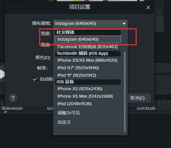 Camtasia的项目设置这里归类了我们经常会使用到的画布规格,可方便我们快速找到目标。