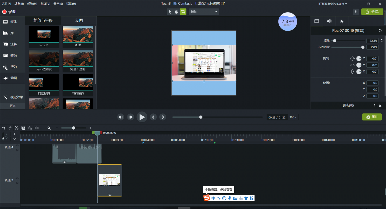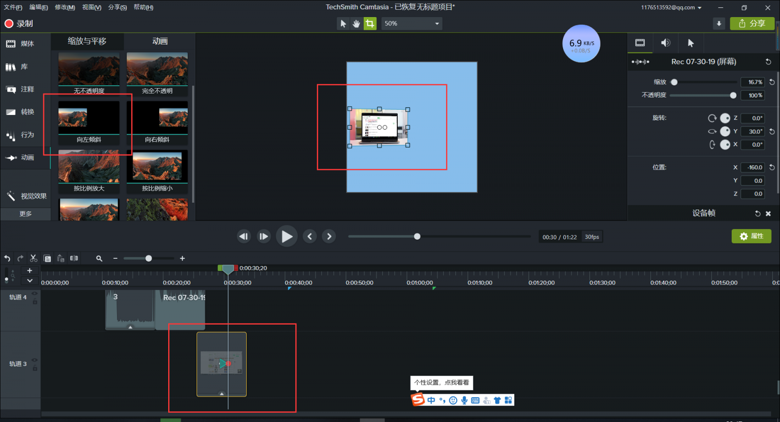 Camtasia有很多动画、转场等效果,那当我们使用完设备帧之后呢,添加的效果是实现到整块个设备帧框架上的(不包括画布背景)。