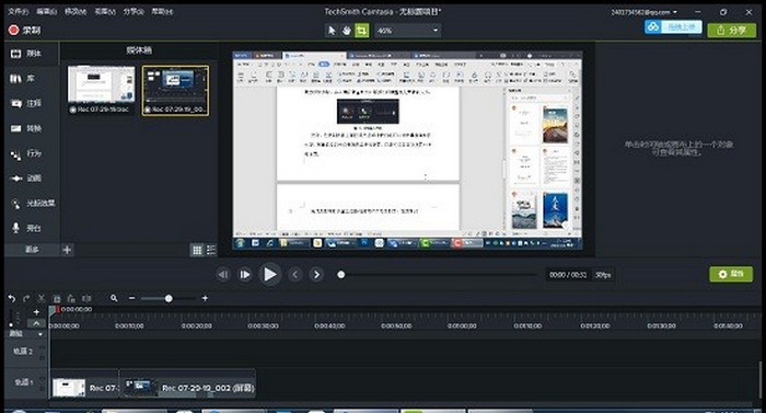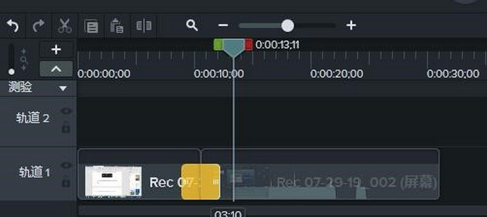 首先我们将两段素材一前一后放在时间轴的同一条轨道上。这里采用的素材是使用Camtasia录制功能随意录制的两段视频,大家在自己的操作中也可以使用自己下载或制作的视频。