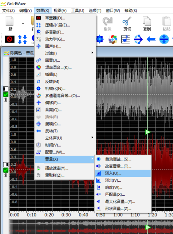 在我们可以用GoldWave给铃声的开头和结尾分别加入“淡入”和“淡出”效果,使铃声的开始和结束更加柔和。在菜单栏中点击效果选项,分别两次点击“淡入”和“淡出”效果。