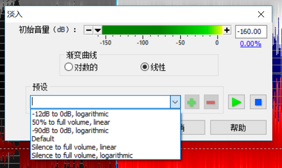 调节淡入和淡出的方式,这里有“对数型”和“直线型”两种淡入曲线。“对数型”会一开始淡入较快,随后逐渐放缓。个人更倾向于“对数型”。你也可以在GoldWave“预设”中选择预设情况。淡出方式的调节与淡入一样。