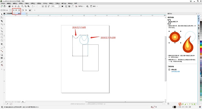 如图3所示,使用电脑的CorelDRAW平面设计软件用户可以在属性栏中调整涂抹工具的压力值大小,通过改变压力参数以达到自己想要的涂抹混色效果。