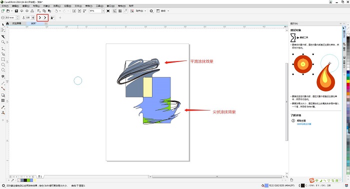 CorelDRAW的涂抹工具还有尖状涂抹和平滑涂抹两种不同的笔触效果。用户在属性栏中就可以直接找到。小编认为,在实际应用当中,尖状涂抹适合于表现凛冽的风,平滑涂抹更适合用于湖面的涟漪。