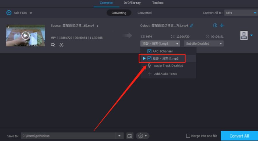 6.最后将音频选择为添加的这个音频文件之后,点击右下角的Convert这个转换按钮就可以将它转换出来并保存视频了。