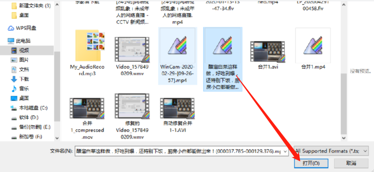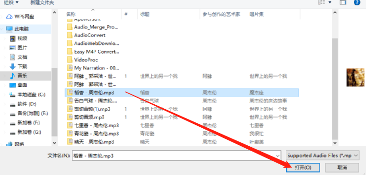 4.点击添加音频之后下一步在出现的选择音频界面中,我们选中目标音频文件之后,点击右下角的打开按钮。