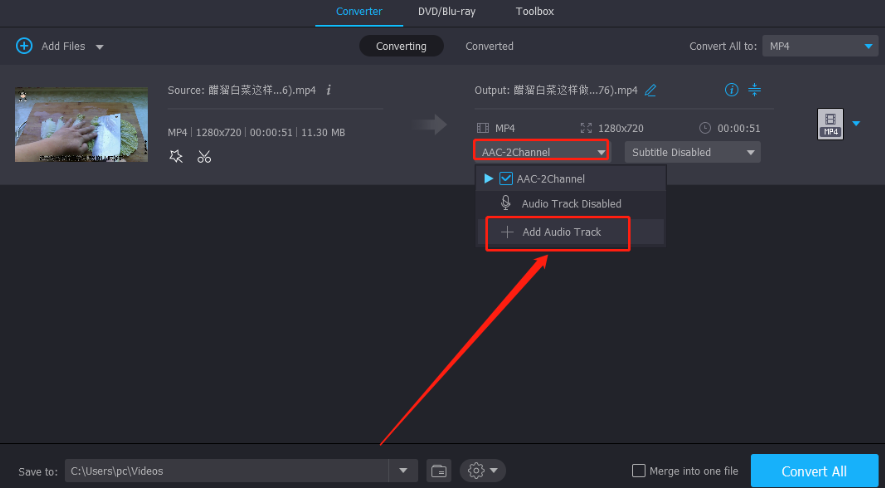 3.点击打开按钮之后视频就添加到了软件界面,我们点击转换目标视频下方的音频选项,然后就可以看到Add Audio Track这个添加音频选项了,需要我们点击它。