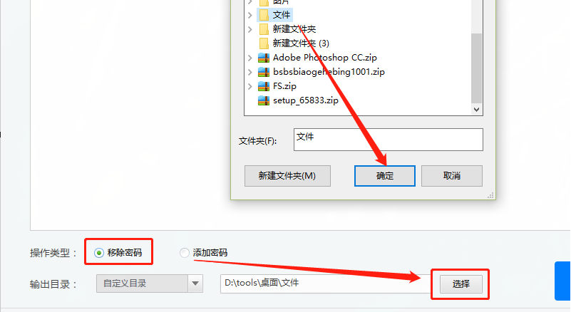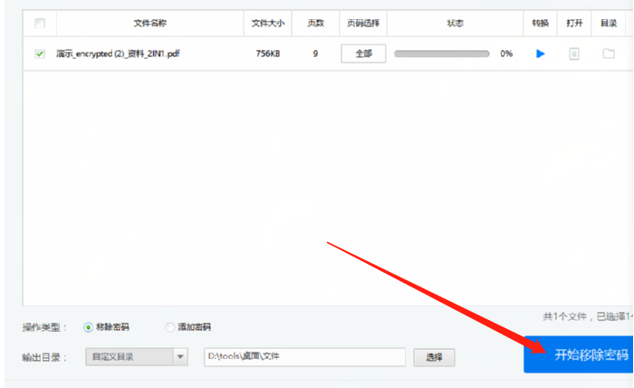 4.点击打开按钮之后我们在操作类型中选择移除密码这个功能,然后点击选择按钮即可在出现的界面中选择文件移除密码之后的输出位置。