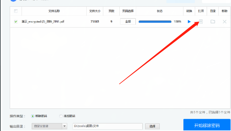 6.等到移除密码操作完成之后我们点击上方打开选项下面的文件夹图标即可打开查看移除密码之后的PDF文件。