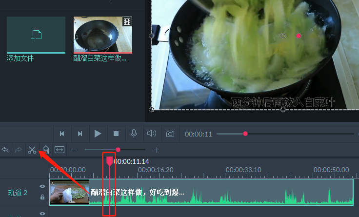 5.将视频移动到操作台之后我们移动指针就可以选择想要剪切视频的位置了,选取好位置之后点击剪刀图标即可进行剪切。