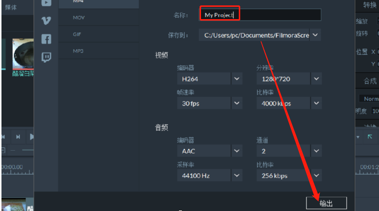 7.点击输出之后我们在界面中设置好视频的参数以及音频参数,填写好文件名称和输出路径之后点击输出按钮即可输出保存剪切的视频片段。